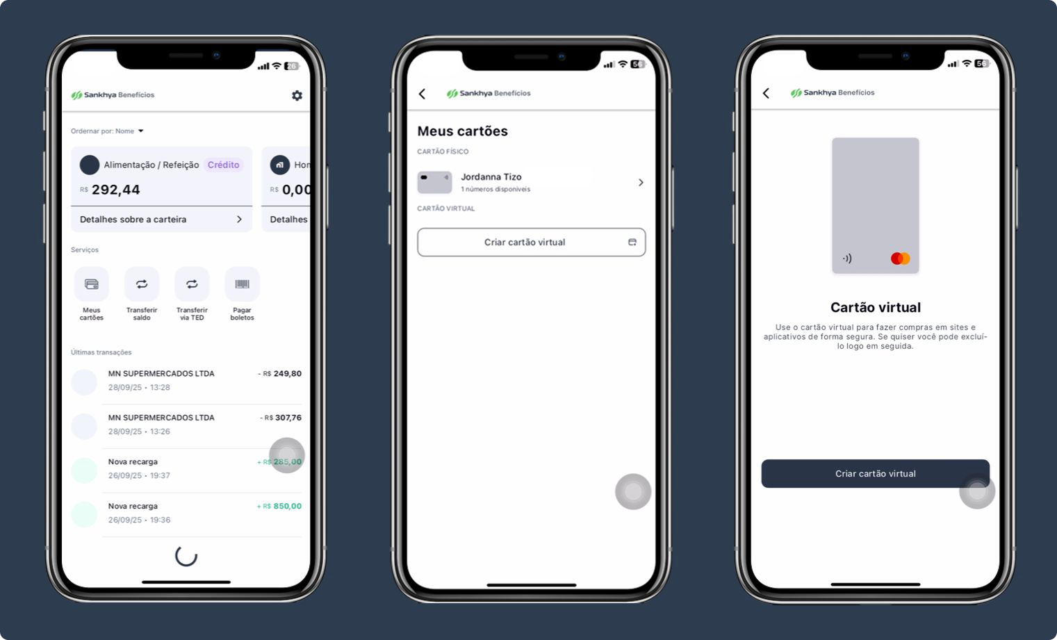 O cartão virtual do Sankhya Benefícios permite que você utilize seus benefícios em carteiras digitais (como Apple Pay e Google Pay), com segurança e praticidade.