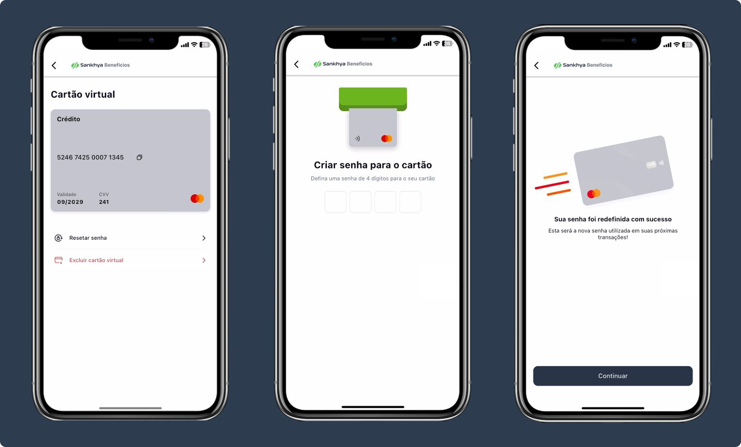 Ao criar o cartão virtual, ele virá inicialmente com a mesma senha de login do aplicativo.