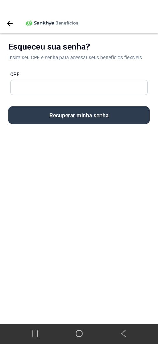 Digite o CPF cadastrado no Sankhya Benefícios e toque em “Recuperar minha senha”.