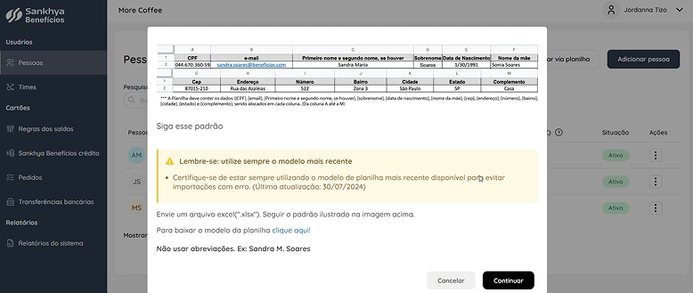 Além do cadastro manual, é possível adicionar colaboradores via planilha de carga.